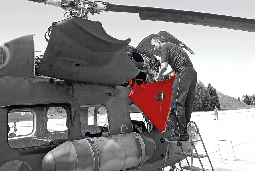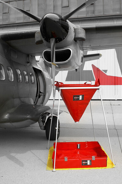 Serve da imbuto di raccolta per l’impiego nei punti difficilmente accessibili dell'aeromobile (rotori, motori, eliche, ecc). Può essere appeso su un supporto speciale regolabile in altezza per facilitare le operazioni di manutenzione da parte dei tecnici. Realizzato in materiale PVC trattato superficialmente per resistere ai prodotti chimici, petroliferi e liquidi tecnici pericolosi.