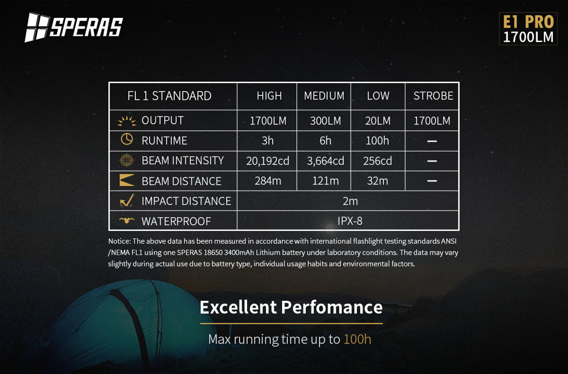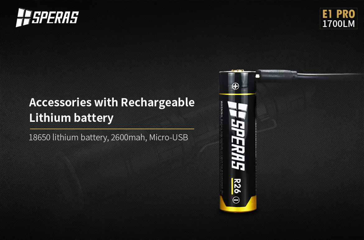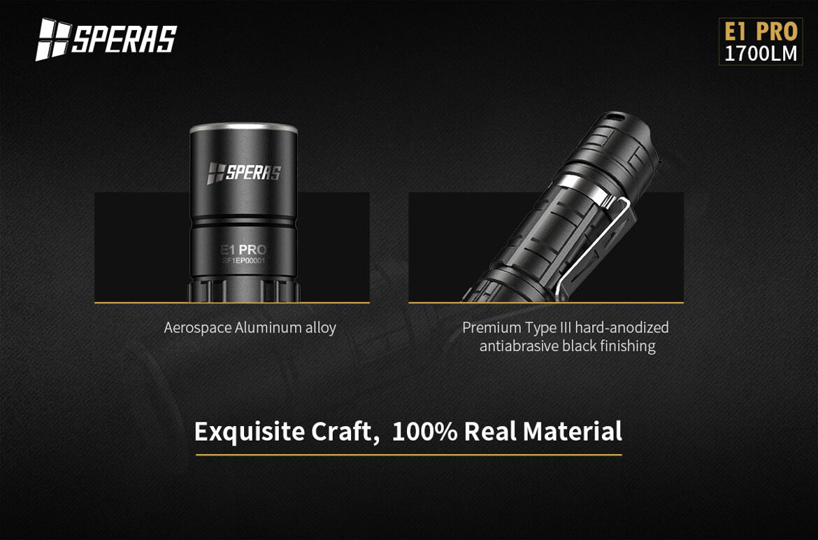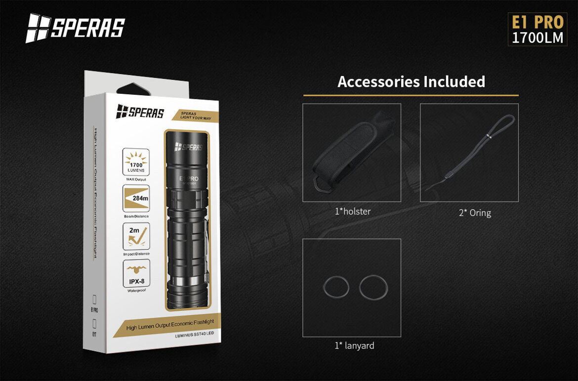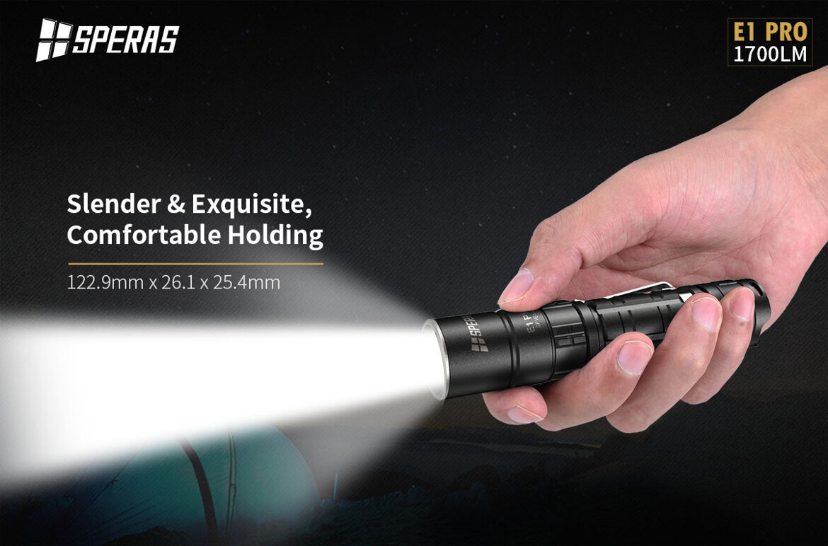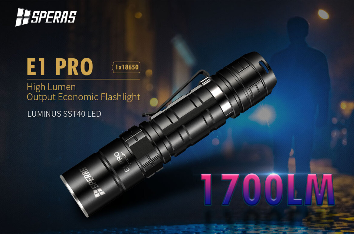 La Torcia tattica E1 PRO della SPERAS è una torcia a Led portatile ad alta luminosità. Questa torcia è dotata di LUMINUS SST40 alimentato da una batteria al litio 1*18650 con un'emissione luminosa massima di 1700 Lumens. Con Circuito con alta efficienza fino al 95% con LUMINUS SST40.